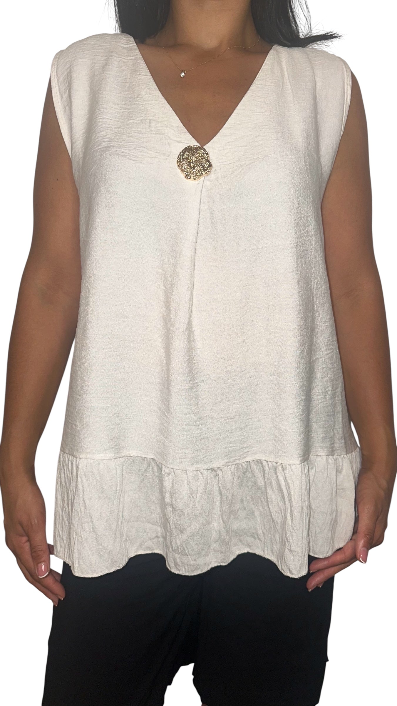 Avec sa coupe ample et son encolure en V, ce haut s'adapte à toutes les morphologies. Disponible en plusieurs couleurs, il offre une polyvalence parfaite. Sa broche dorée ajoute une touche élégante. Idéal pour les looks décontractés ou semi-formels.