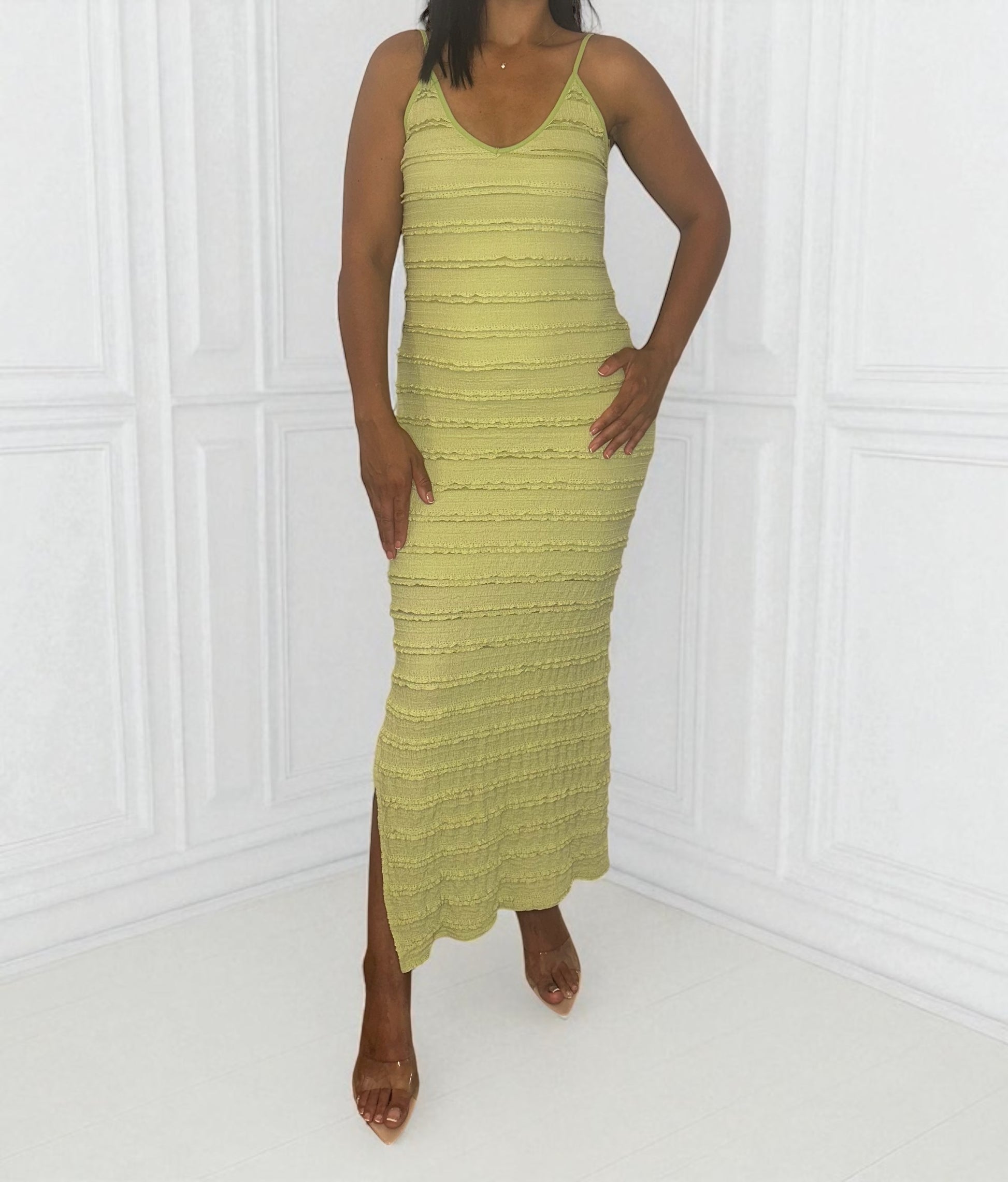 Cette robe longue à la coupe près du corps vous séduira par son style subtil. Parfaite pour sublimer votre silhouette, elle offre une allure gracieuse. La robe est confectionnée dans un tissu doux, extensible et texturé. Idéale pour les journées où vous souhaitez vous sentir à la fois confortable et chic.
